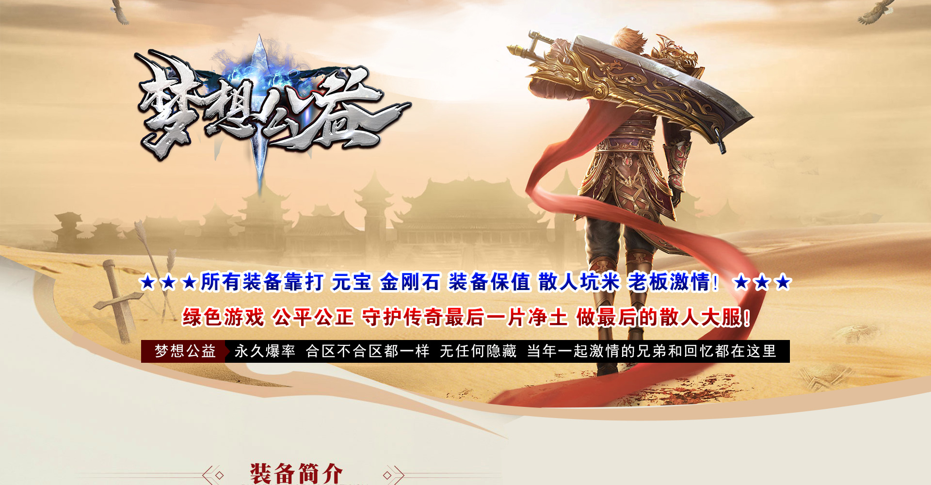 【经营理念】:绿色游戏,公平公正,守护传奇最后一片净土,做最后的散人大服。