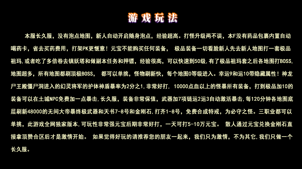 所有地图0等级进入,地图超多,怪物刷新快,元宝不能购买任何装备,没有无怪可打情况